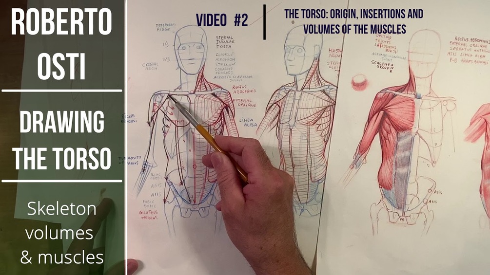 In the first video I discuss the skeletal and structural characteristics of the human torso: volumes, proportions and landmarks on the front and three-quarter view of ribcage and pelvis.